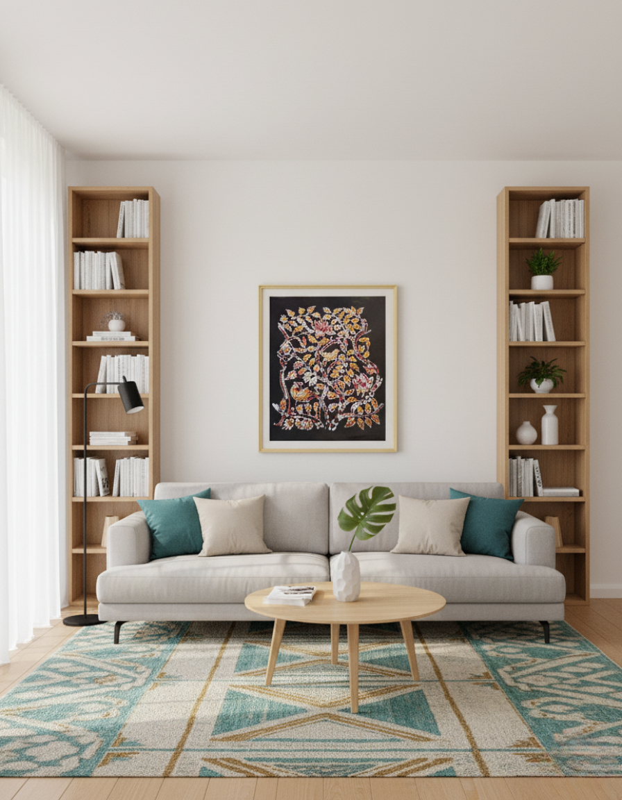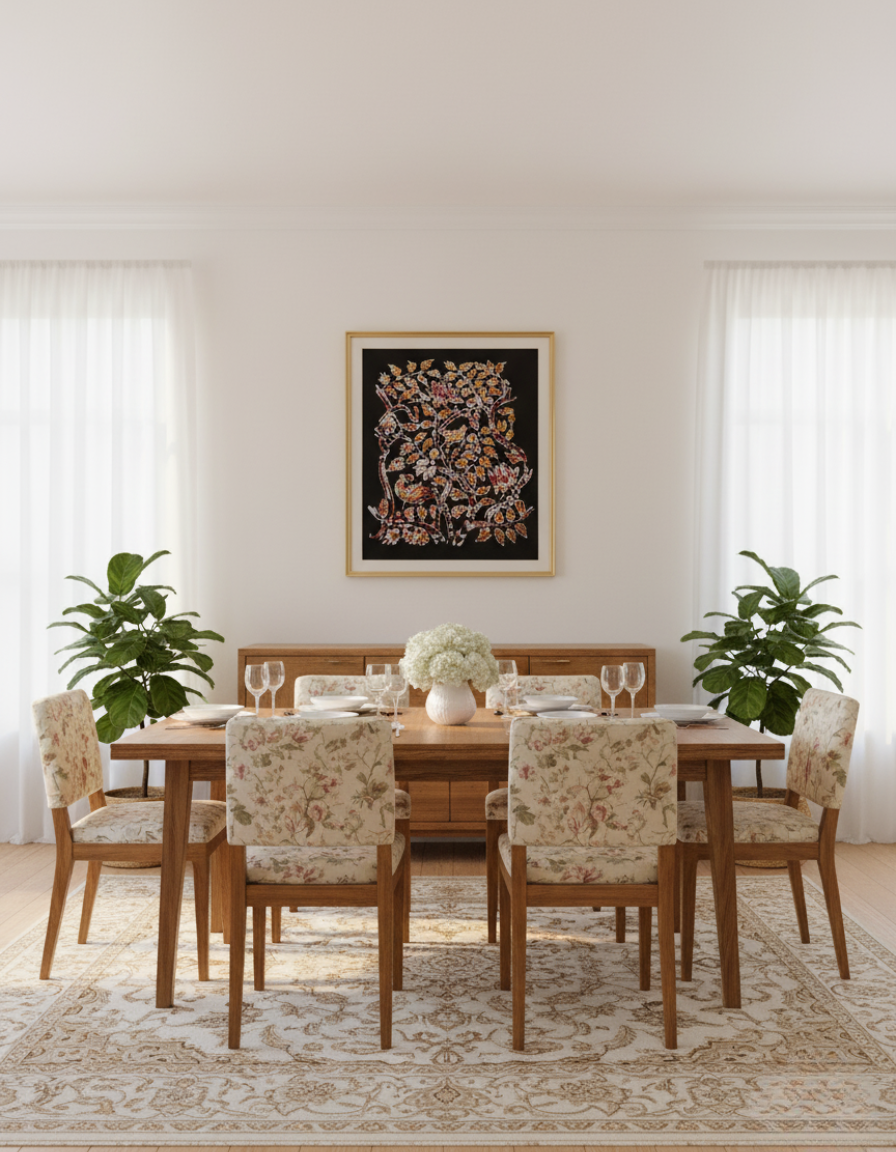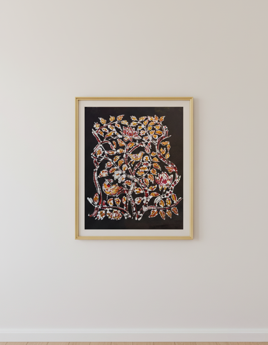 Immerse yourself in the gentle harmony of nature with this Birds and Flowers wall décor, hand-crafted in traditional batik on pure cotton cloth. The graceful birds and blooming flowers entwined together symbolize freedom, beauty, and the eternal cycle of life, inviting you to pause, breathe, and reflect.