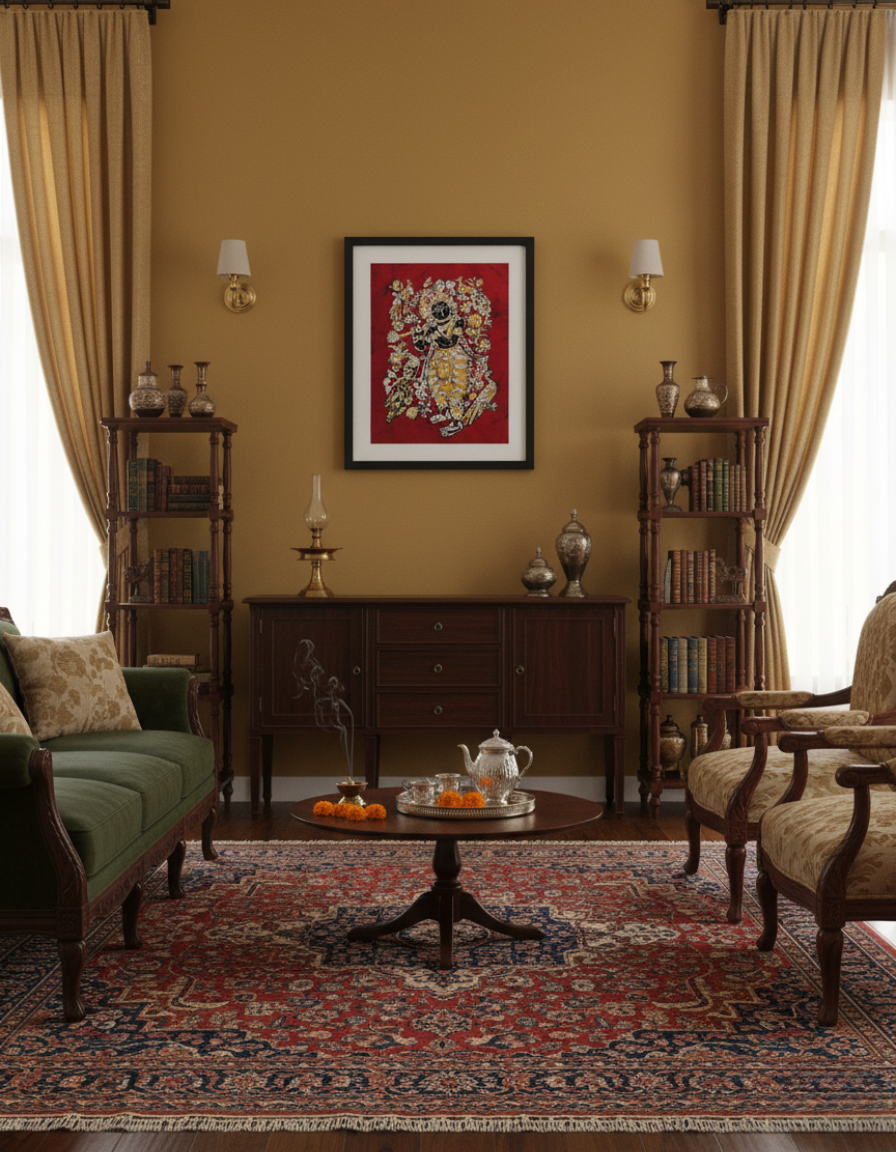 The rich red backdrop accentuates the detailed patterns, radiating warmth, devotion, and cultural richness. Perfect for living rooms, meditation corners, restaurants, and devotional spaces, this décor adds an aura of divinity, artistry, and traditional elegance.