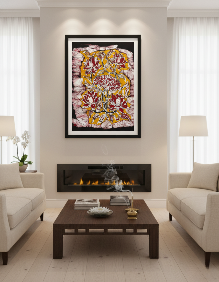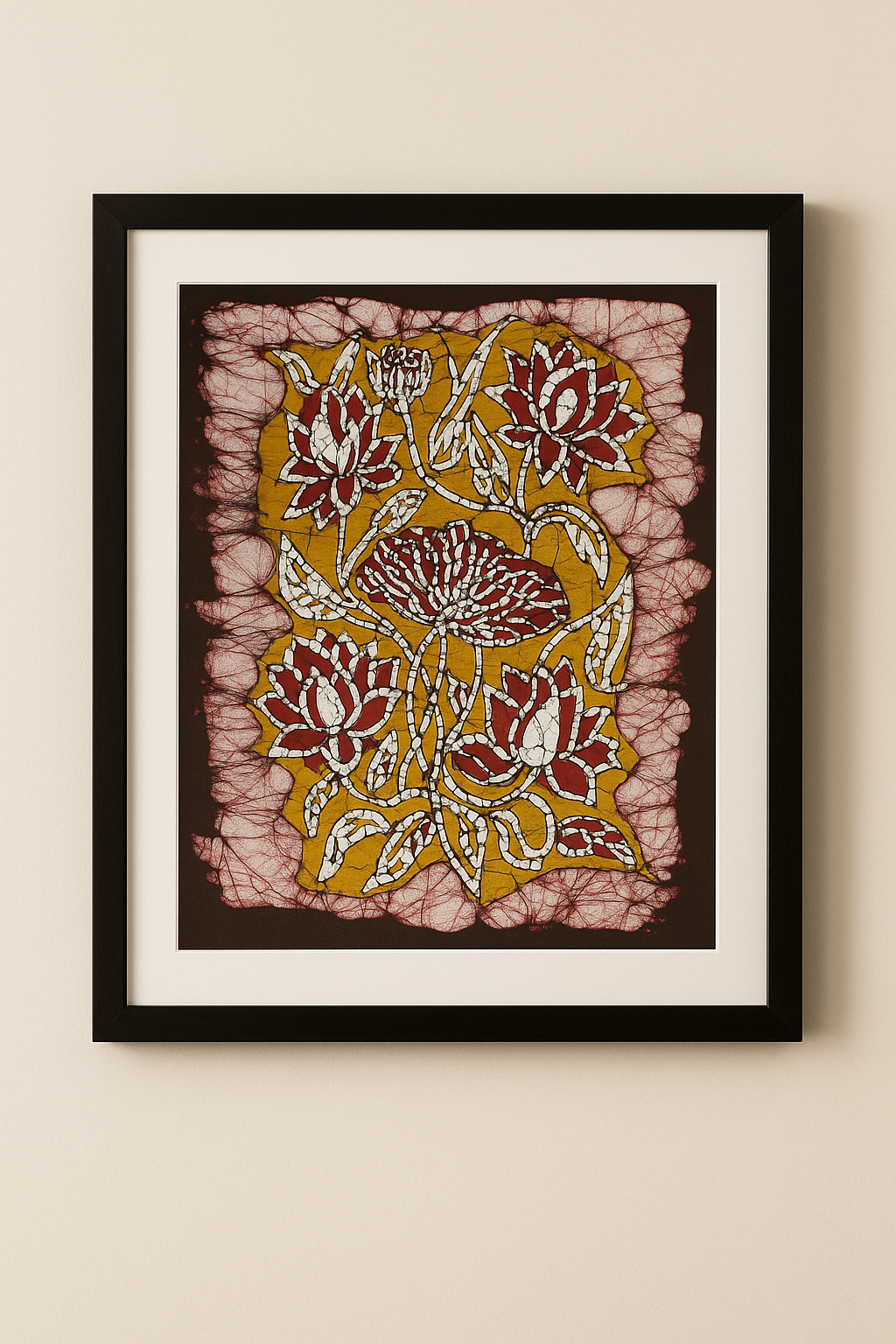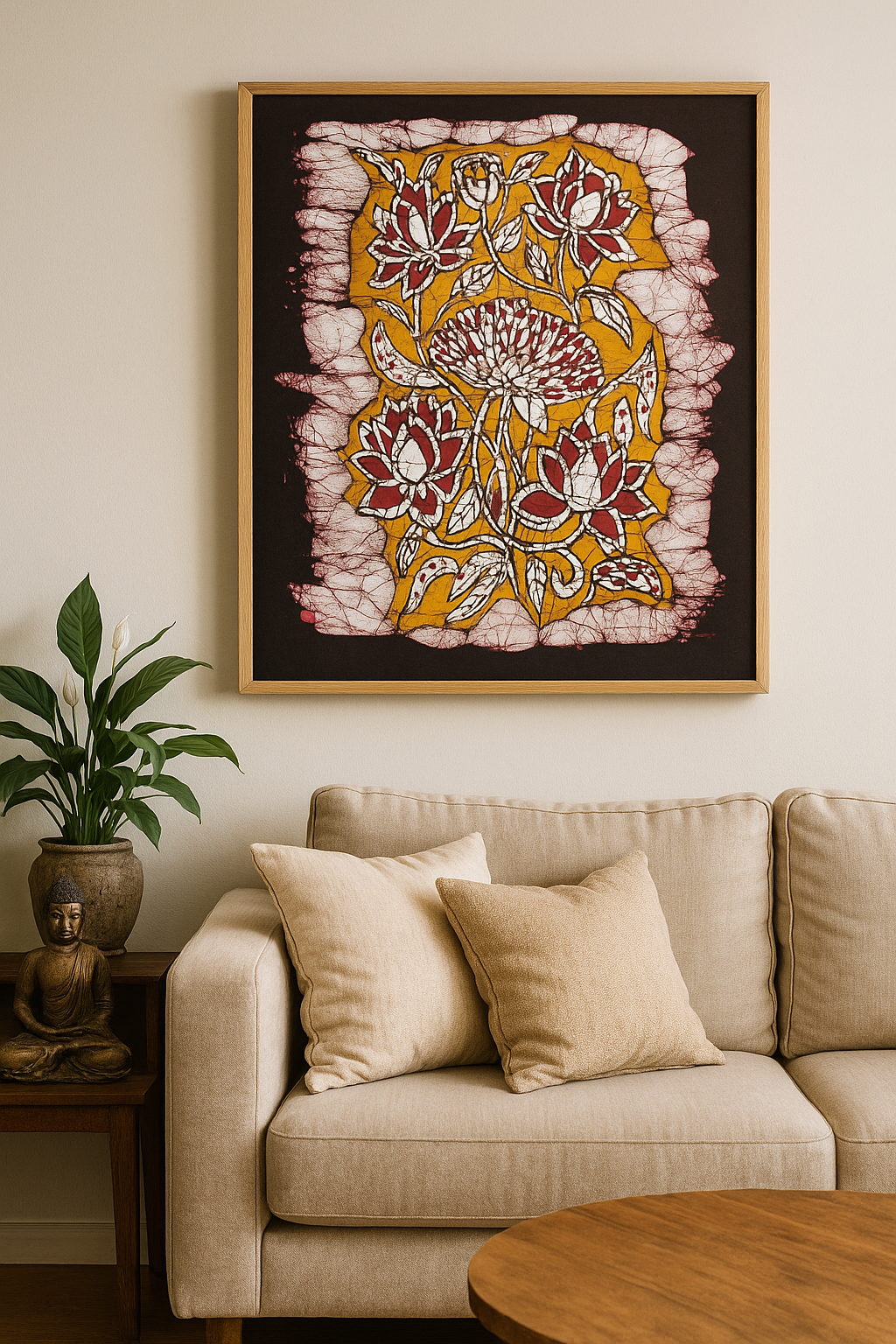 Each petal, bathed in shades of maroon and gold, tells a story of resilience, beauty, and awakening. The intricate batik patterns reflect devotion and craftsmanship, infusing your space with calm energy and sacred elegance.