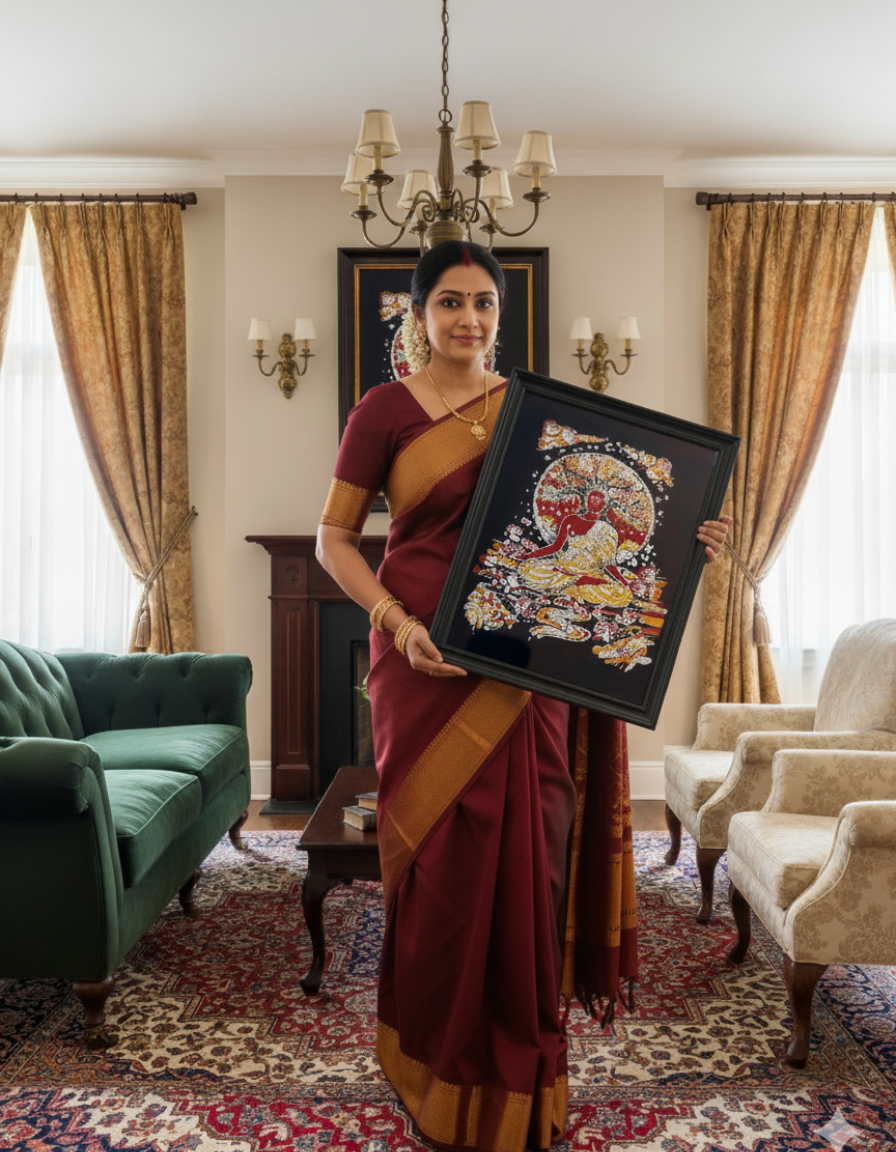 Radiating tranquility and divine grace, this exquisite Buddha Lotus wall décor is hand-crafted in traditional batik on pure cotton cloth. The serene figure of Buddha seated on a blooming lotus symbolizes purity, enlightenment, and the awakening of consciousness — a gentle reminder of inner balance and peace amidst life’s flow.