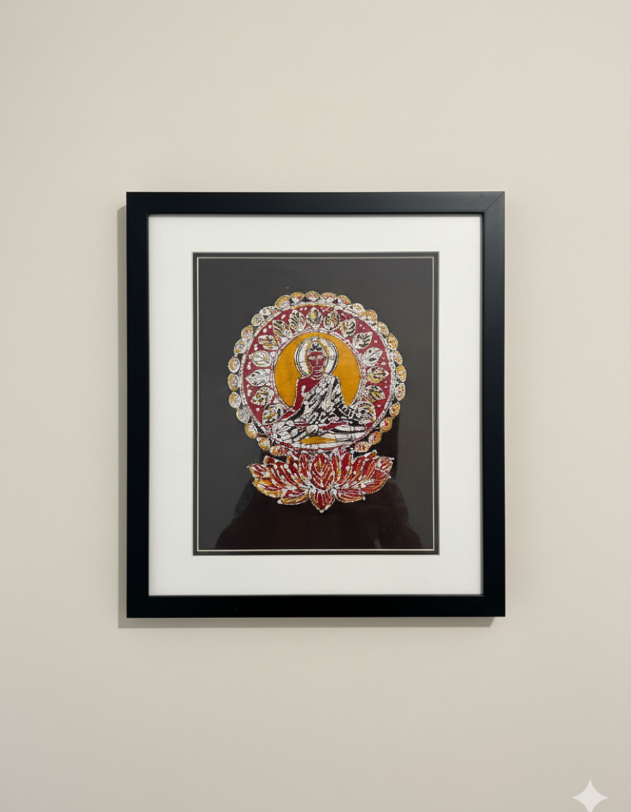 Each detail, from the sacred lotus petals to the halo of enlightenment, reflects the skill and devotion of traditional batik artisans. Ideal for living rooms, meditation corners, yoga halls, restaurants, and spiritual spaces, this décor infuses your environment with serenity, wisdom, and spiritual elegance.